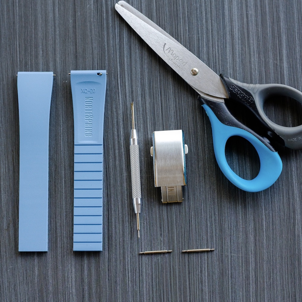 - Para obter o ajuste perfeito, remova o fecho desdobrável NorteSpring com a ferramenta para barras de mola incluída com a bracelete. Em seguida, corte gradualmente cada lado da bracelete com uma tesoura, seguindo as marcações existentes no verso.