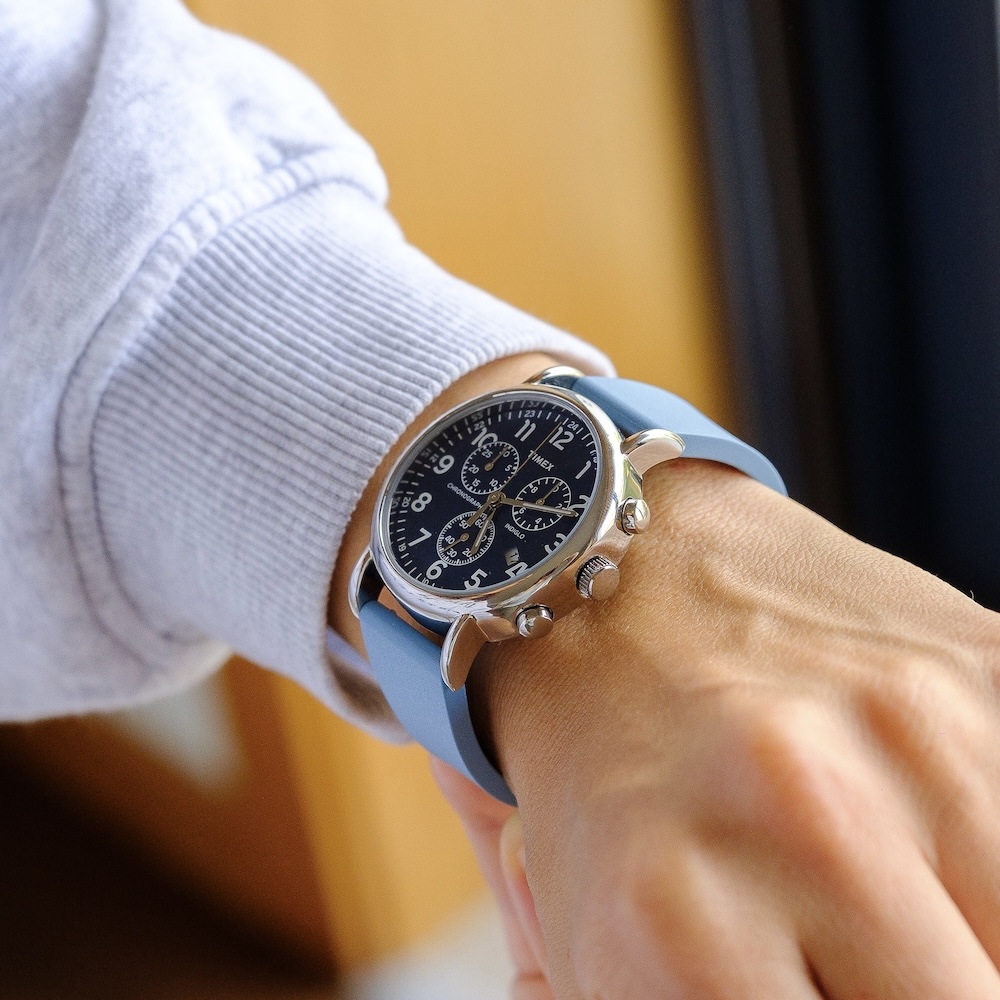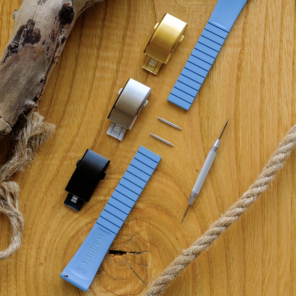 O sistema Cut To Size permite cortar a bracelete à medida, enquanto o fecho desdobrável com quatro posições de microajuste garante um encaixe preciso e confortável. Disponível em 18, 20 e 22 mm e em seis cores versáteis, adapta-se facilmente a relógios clássicos, desportivos ou de uso diário.